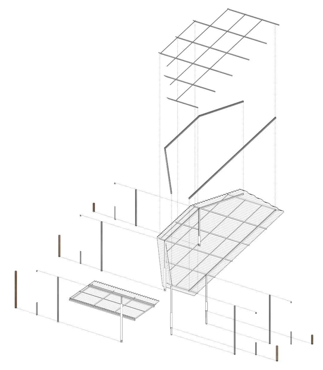 作为支撑结构,雨棚的细柱采用了钢木结合的建造方式。在柱础和柱梁交接的位置,扁钢与木杆拟态了燕尾榫。将传统木构节点形式转译并使用在工业材料上,就形成了一种独特有趣的现代语汇,使结构兼有了木构的精致和金属的轻盈。