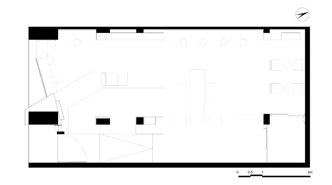 房屋主体是传统砖木结构的。两侧山墙为砖砌,楼板则是木结构的。木梁的跨度限制导致室内中心落了几根柱子,在本就不宽的横向上又做了一处分割。相较于局促的空间宽度,进深则有些过于幽长了。空间自身的劣势对经营改造有着不小的影响。