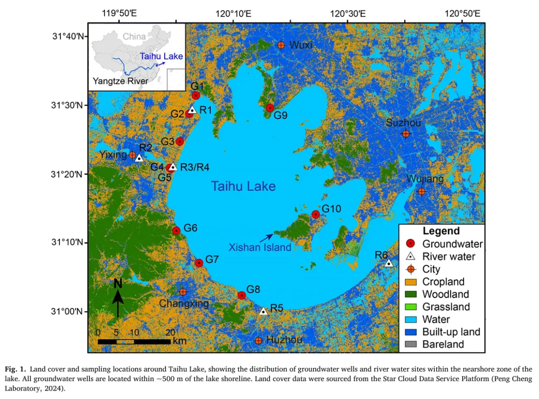太湖位于长江三角洲,是一个大型浅水淡水湖泊,湖面面积2338平方千米,平均水深1.9米,周边分布有多座大型城市,为近2000万人口提供重要的饮用水来源。太湖流域属典型亚热带季风气候,1981–2010年多年平均气温16.2摄氏度,年均降水量1122毫米,降水主要集中在5至9月。太湖盆地下伏第四系松散沉积物,厚度一般为50至300米,孔隙发育,渗透性较好。潜水含水层厚度约2至5米,地下水位埋深通常在地面以下1.0至3.0米,季节性波动可达1米。太湖盆地浅层地下水与地表水之间水力联系密切,盆地西南部大部分时间地下水位高于地表水位。