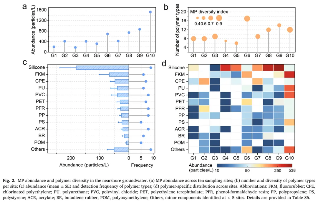近岸地下水微塑料多样性同样高于全球多数研究。各采样点的辛普森多样性指数介于0.38至0.90之间,均值为0.72,超过全球均值0.62(该值为高低多样性的分界阈值)。十个采样点共鉴别出22种聚合物类型,各点含6至17种,其中12种聚合物在5个或以上采样点检出,分布广泛。在检出的聚合物中,硅橡胶、氟橡胶和氯化聚乙烯丰度最高。尽管这三种聚合物在地下水研究中鲜有报道,但在污水处理厂出水和城市地表水中频繁检出,其在无锡市(太湖重要毗邻城市)附近河流中的检出进一步验证了本研究聚合物鉴定结果的可靠性。相比之下,聚丙烯、聚氯乙烯、聚对苯二甲酸乙二酯和聚苯乙烯等常见聚合物类型在地下水中丰度相对较低,但在太湖及周边河流地表水中更为普遍。
