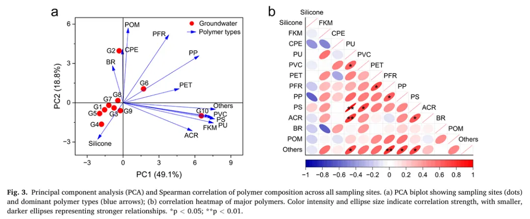 通过对十个地下水采样点聚合物组成的主成分分析,发现七个采样点(G1、G3、G4、G5、G7、G8、G9)形成紧密聚类,以硅橡胶为主要聚合物(在四个采样点占比超过50%),这七个点均位于主要城市区下游10千米以内,表明生活污水可能是重要的微塑料来源,与无锡市污水处理厂出水中硅橡胶占主导地位的发现一致。