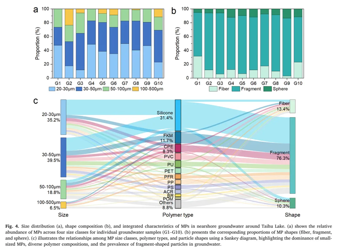 微塑料形态以碎片状为主,占全部检出颗粒的76.3%,纤维状(13.4%)和球形(10.3%)次之。碎片状颗粒遍布各粒径等级和聚合物类型,表明大型塑料的环境风化与机械破碎可能是地下水微塑料的重要来源。总体而言,近岸地下水中微塑料以小粒径、碎片状颗粒为主,这类颗粒在多孔介质中的迁移性通常更强。室内柱实验表明,细小且形状不规则的微塑料可在渗流驱动下穿透砂质介质;野外示踪实验亦证实,极细微塑料(1–5微米)可在冲积含水层中迁移达200米以上。在太湖周边砂质、粉砂质的非固结浅层沉积物中,这一迁移过程尤为有利于微塑料经LGD输送至湖泊。