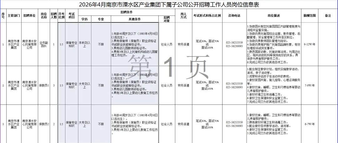 本次招聘的岗位、数量、资格条件等相关信息,在南京市溧水区人民政府网站(www.njls.gov.cn)、“溧水人力”微信公众号、溧水114网站(www.ls114.cn)发布。联系方式详见《2026年4月南京市溧水区产业集团下属子公司公开招聘工作人员岗位信息表》(附件1,以下统一简称《岗位信息表》)。