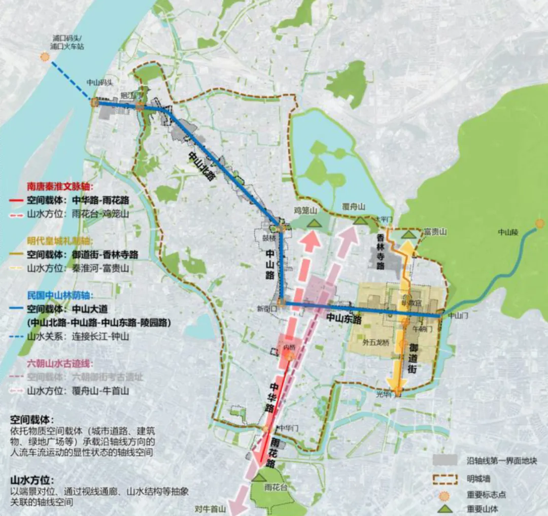 这不是简单的概念堆砌,而是对城市文脉资产的精准定位。其中,南唐秦淮文脉轴(空间载体:中华路、雨花路)承载着烟火城南与风雅秦淮的记忆 ;明代皇城礼制轴(空间载体:御道街、香林寺路)重释了庄重的中华礼制空间 ;而民国中山林荫轴(空间载体:中山北路、中山路、中山东路、陵园路)则串联起近现代南京的发展脉络 。再加上寻访古迹的六朝山水古迹线,整个老城的历史坐标瞬间立体了起来。