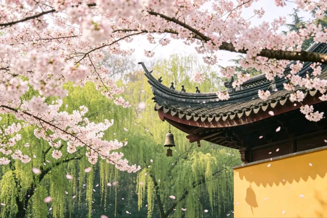 天边的云烧起来了,先是橘红,再是玫瑰紫,最后融成一片青灰。鸡鸣寺的钟声响了,沉沉的,悠悠的。城墙的影子越拉越长,终于把半个湖都罩在阴影里。只有湖心那一带,还浮着一片金光,久久不肯散去。樱花还在落,飘在金光里,像是金色的雪。