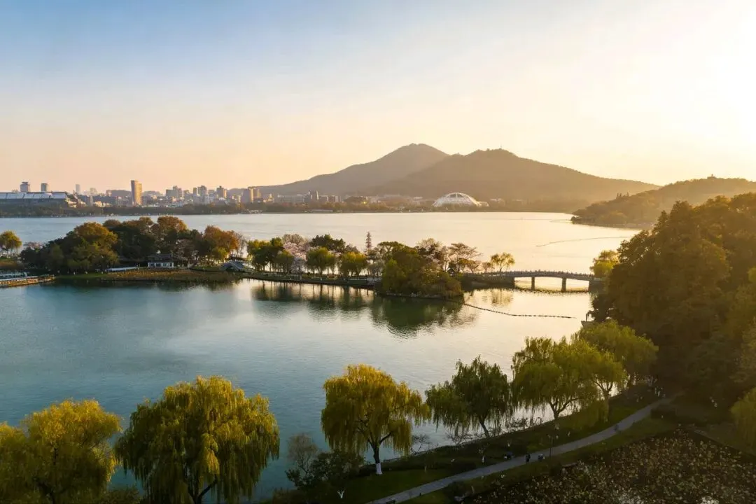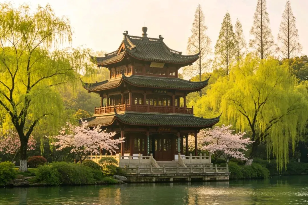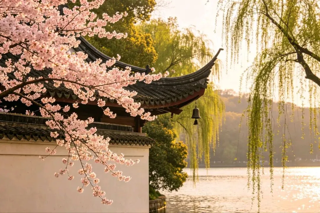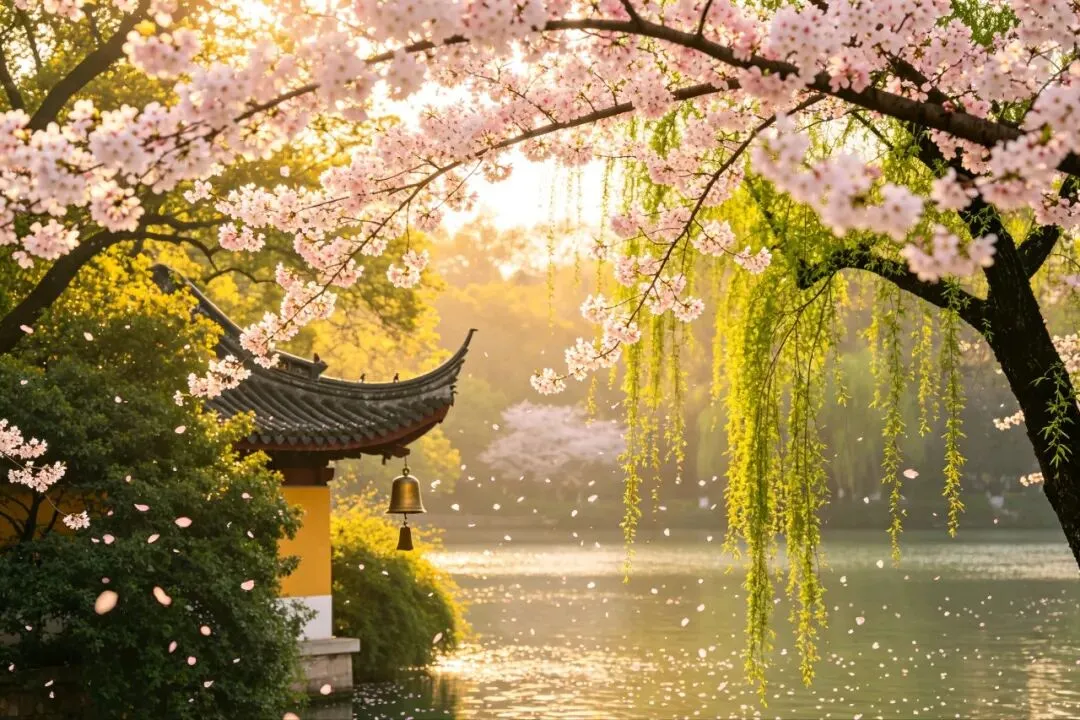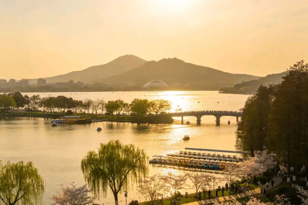 黄昏来得不紧不慢。太阳斜挂在西边,光线变得柔软而温暖,给所有的东西都镀了一层金。湖面起了细浪,粼粼地,像是无数金片在跳跃。有游船从远处归来,船上的人笑着,说着,桨声欸乃,搅碎了一湖金波。近岸的柳条垂到水里,随着水波轻轻摆动,依依地,像是要挽留什么。樱花还在飘落,悠悠地,慢慢地,仿佛知道这黄昏值得慢慢过。
