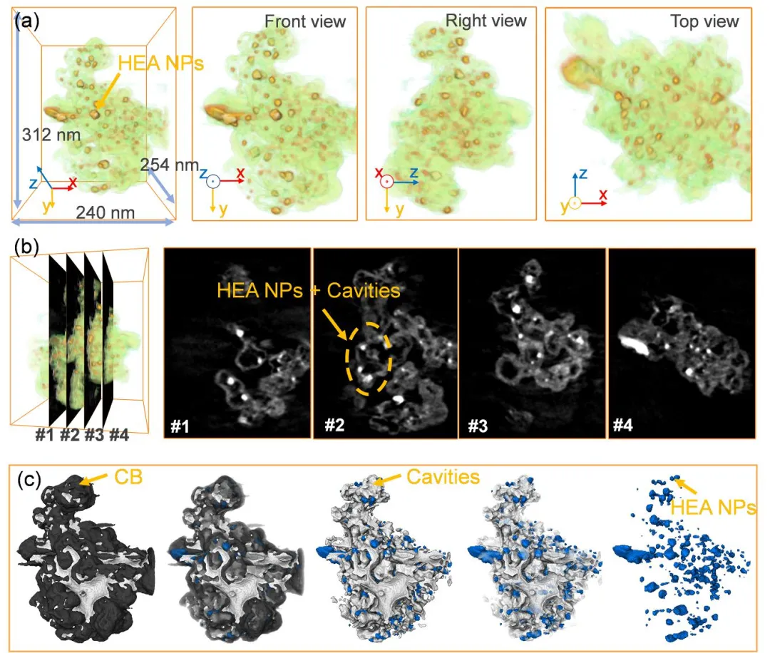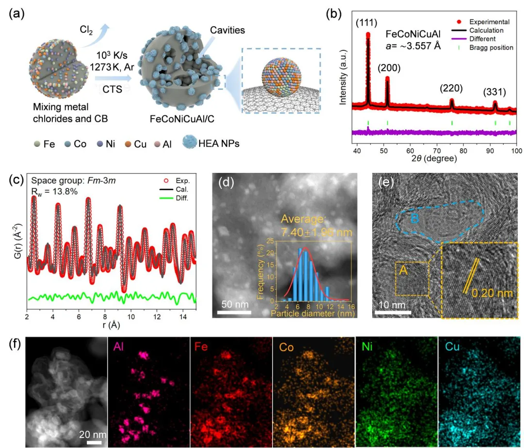 通过一步超快热冲击(CTS)策略,以金属氯化物和碳黑为原料,利用快速加热引发气体爆炸式释放,同步形成多级多孔碳骨架并原位生成均匀分散的 FeCoNiCuAl HEA 纳米颗粒(~7.4 nm)。三维重构证实空腔体积占比达 28%,形成了有利于传质和活性位点暴露的纳米反应器结构。