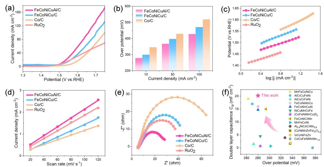 电化学测试表明,FeCoNiCuAl/C 在 10 mA·cm⁻² 下的过电位仅为 280 mV,优于商业 RuO₂(295 mV)和不含 Al 的 FeCoNiCu/C(300 mV)。其 Tafel 斜率更小(70.9 mV·dec⁻¹),双电层电容更高(20.2 mF·cm⁻²),表明 Al 的加入优化了反应动力学并增加了活性位点密度。