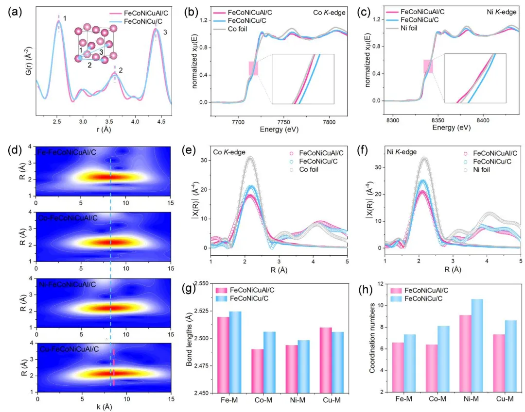 同步辐射 XAFS 和 PDF 分析表明,Al 的引入使 Fe、Co、Ni 的第一壳层键长缩短、配位数降低,并使其电子密度增加(吸收边向低能移动)。WT-EXAFS 进一步显示 Al 优先与 Fe、Co、Ni 配位,而 Cu 趋于聚集,形成了有利于中间体吸附的局域结构。