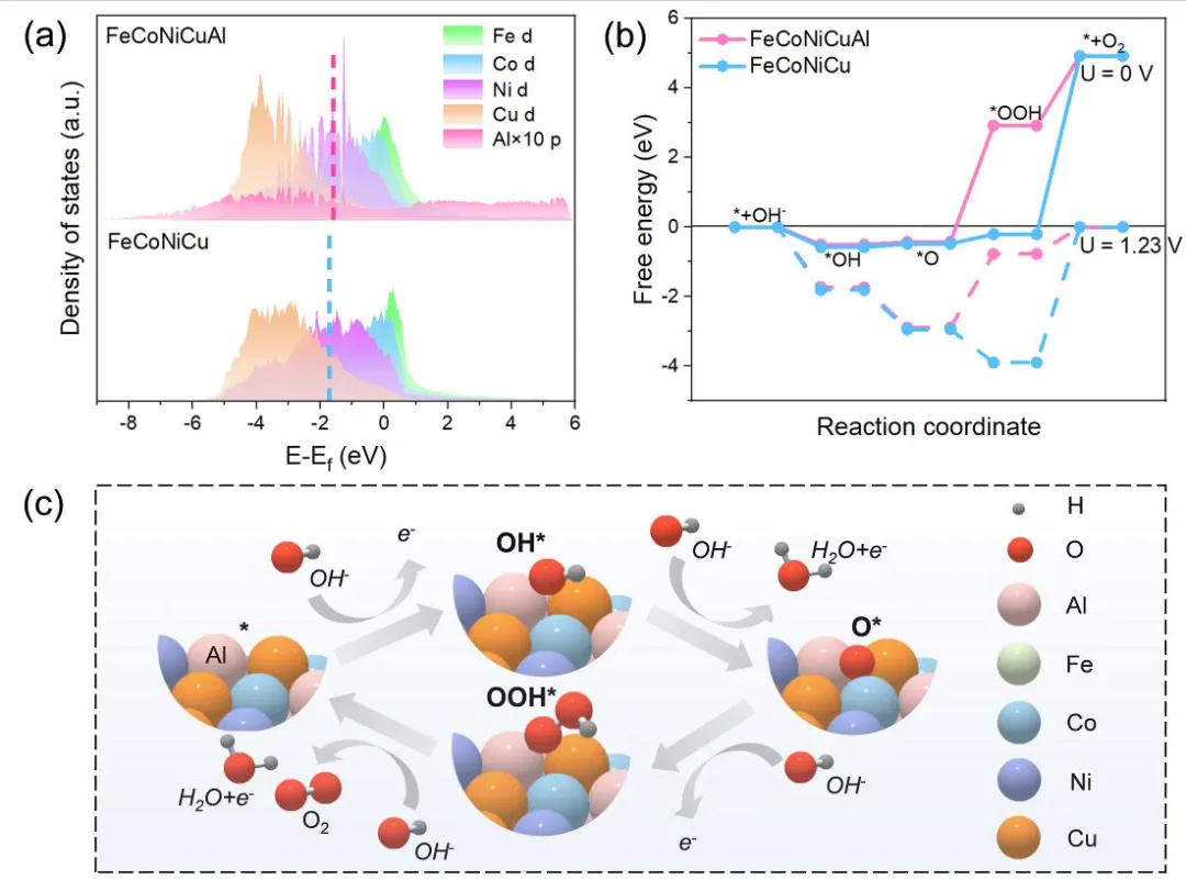 DFT 计算表明,Al 的引入使 d 带中心上移,增强了催化位点的吸附能力。在反应路径中,Al 与邻近金属(Fe、Co、Ni)协同参与中间体的稳定,将决速步(*OOH 脱附)的能垒从 5.12 eV 大幅降低至 2.00 eV,从而加速了 OER 动力学。