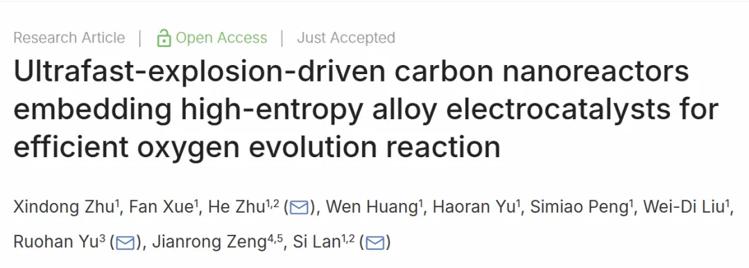 2026年3月,南京理工大学朱贺/兰司、武汉理工大学余若瀚等在《Nano Research》期刊发表题为"Ultrafast-explosion-driven carbon nanoreactors embedding high-entropy alloy electrocatalysts for efficient oxygen evolution reaction"的研究论文。该研究提出了一种超快热爆炸策略,一步合成碳包覆纳米反应器均匀嵌入FeCoNiCuAl高熵合金纳米颗粒。该方法利用金属氯化物快速分解释放气体,将炭黑膨胀成层级多孔网络,同时实现HEA纳米颗粒的成核与限域。所得催化剂在10 mA cm⁻²电流密度下过电位仅280 mV,优于商业RuO₂,并在全解水和锌空气电池中展现出优异的实际应用潜力。
