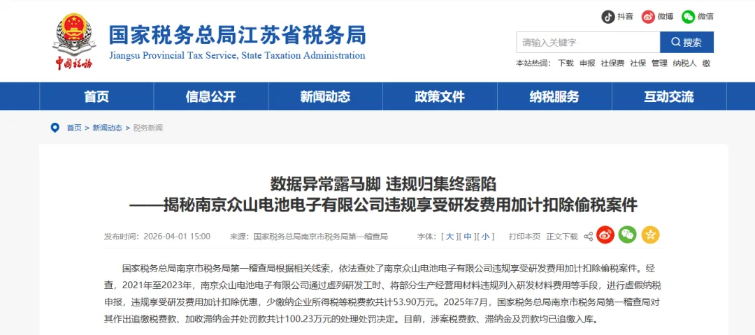 4月1日,国家税务总局南京市税务局第一稽查局通报:南京众山电池电子高新技术企业因在2021年至2023年间,通过虚列研发工时、混同生产与研发材料等手段,违规加计扣除357.88万元,最终补罚100.23万元,再次暴露出制造业典型问题。