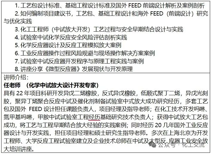 本课程融合国际前端设计标准与国内工程实践,通过大量真实项目案例剖析,深入讲解从微型反应器技术开发到工业装置风险规避的全链条解决方案。旨在帮助工程师与研发团队系统掌握工艺开发与安全早期融合的关键方法论,提升从实验到生产的成功率和本质安全水平。现诚邀您共同探索,赋能工艺创新,驾驭工程放大!具体安排如下: