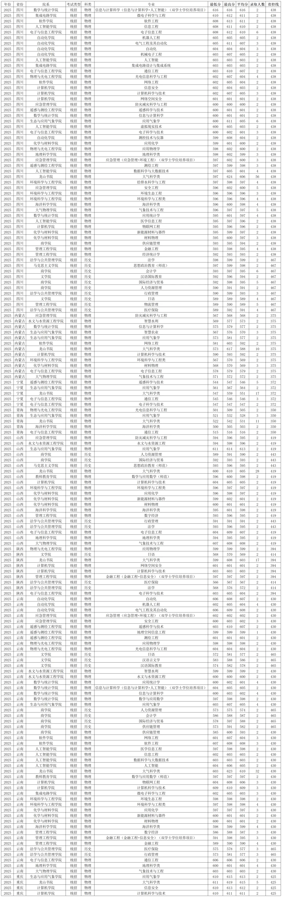 南京信息工程大学2025年在四川本科批物理类录取分数线较高的专业 :信息与计算科学(信息与计算科学+人工智能)(双学士学位培养项目)616分、微电子科学与工程610分、软件工程608分、信息工程608分、电子信息工程608分,最低的是经济统计学592分。