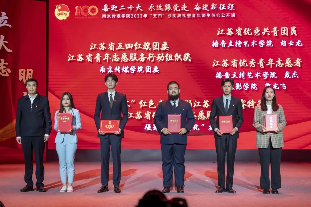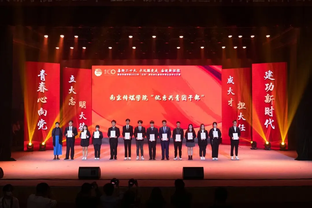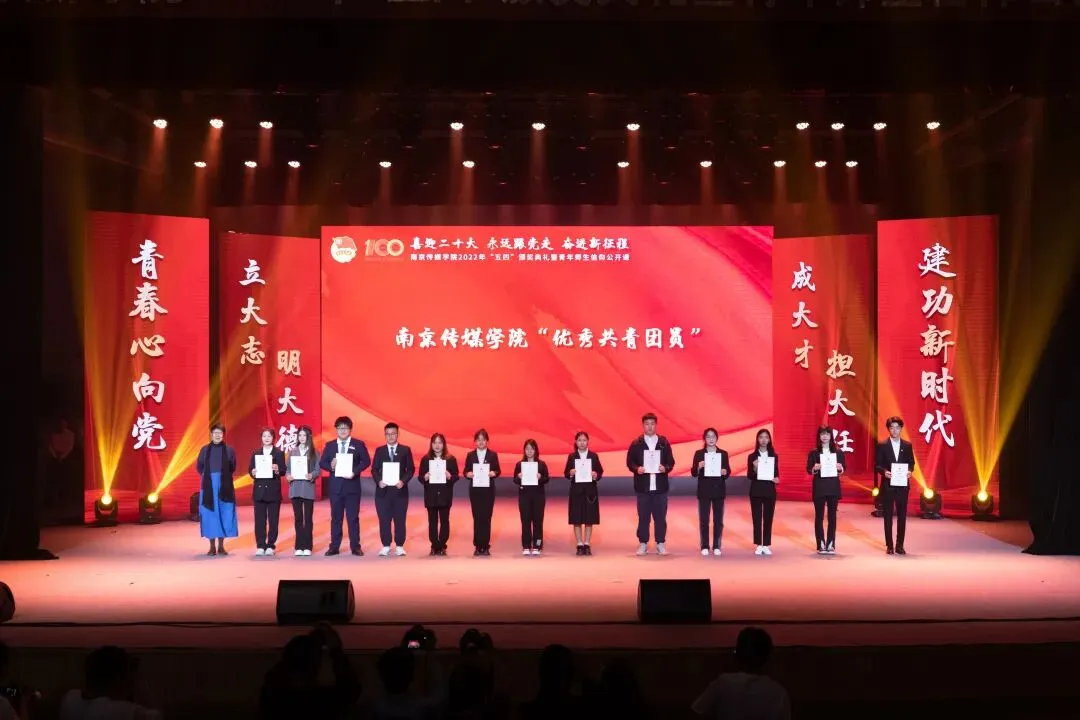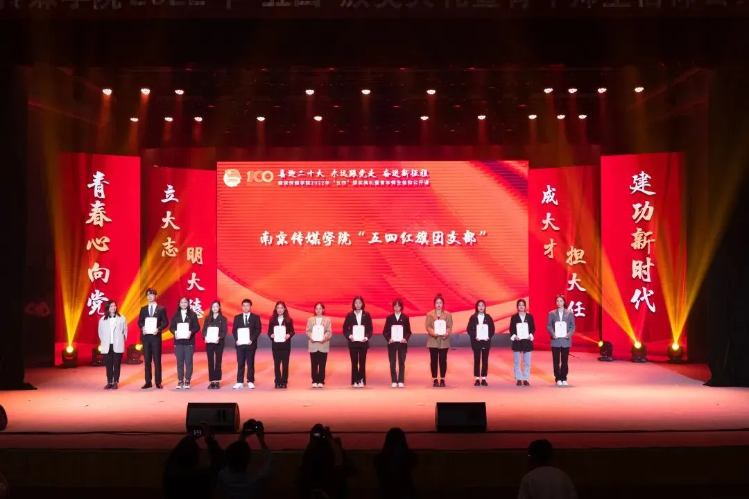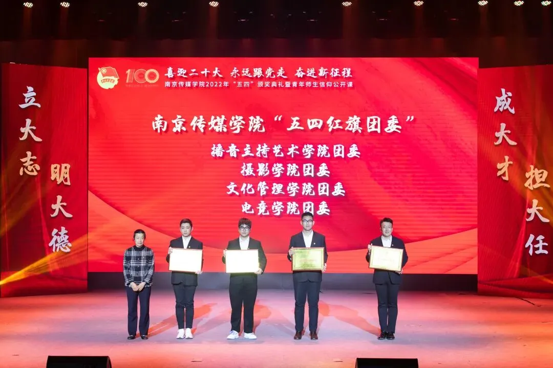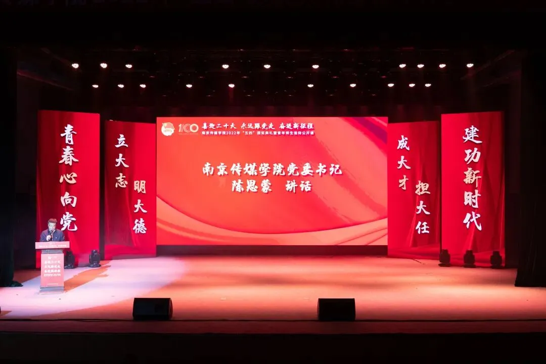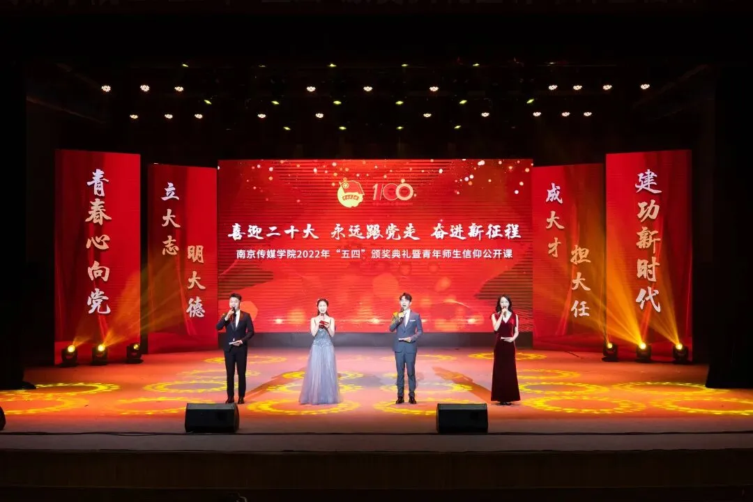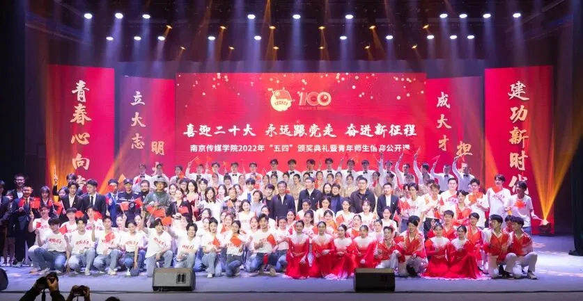 2022年5月4日,“喜迎二十大、永远跟党走、奋进新征程”南京传媒学院2022年“五四”颁奖典礼暨青年师生信仰公开课在实验剧场隆重举行。校党委书记、副校长陈思蒙,常务副校长郎劲松,党委副书记吕艳,党委副书记王宇甜,副校长陈小波,副校长李元临,各学院党总支书记、分团委书记出席本次颁奖典礼,各学院团员代表到场参加,广大团员青年在“南传青年”抖音号观看了直播。
