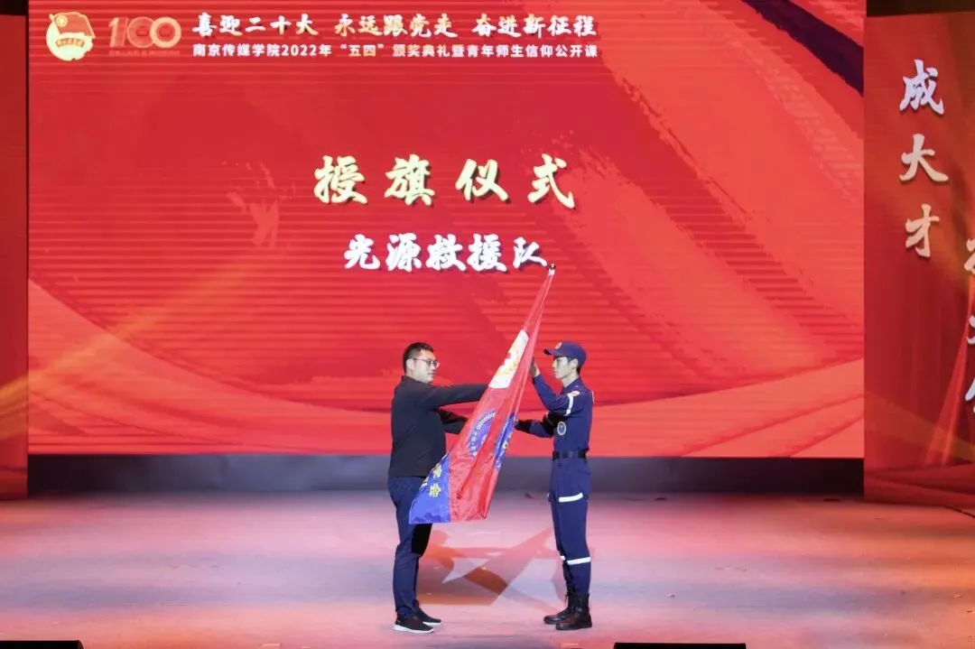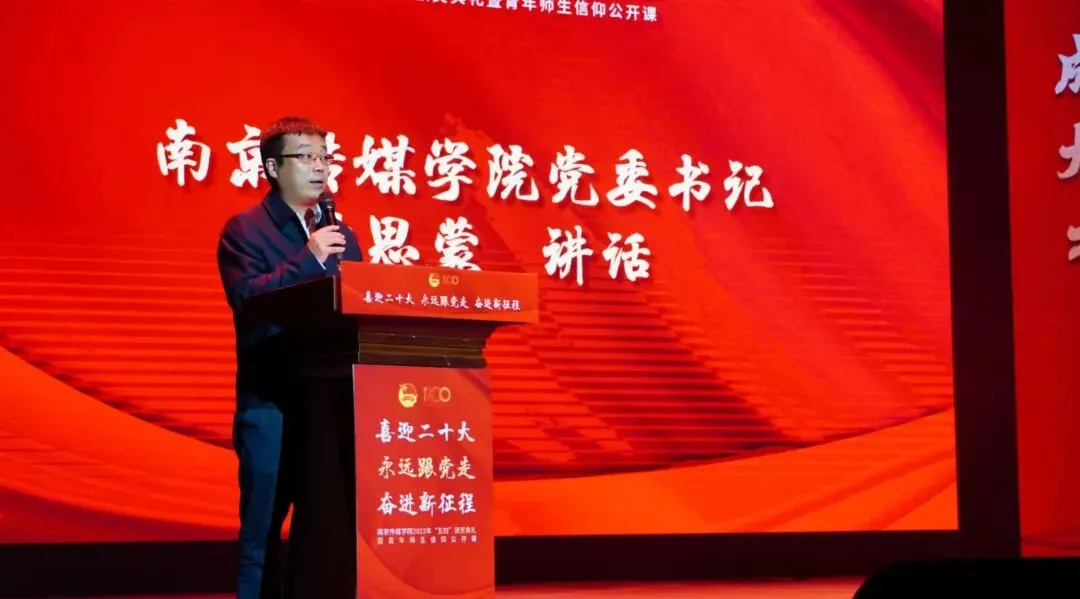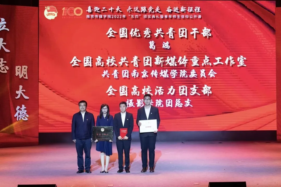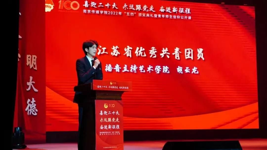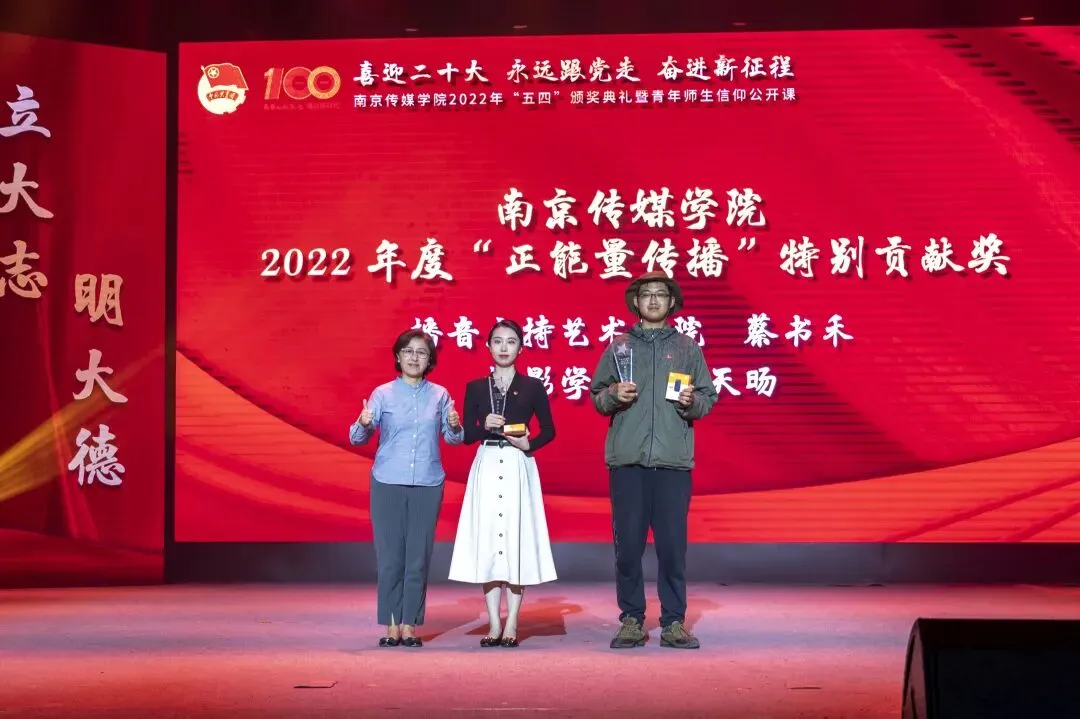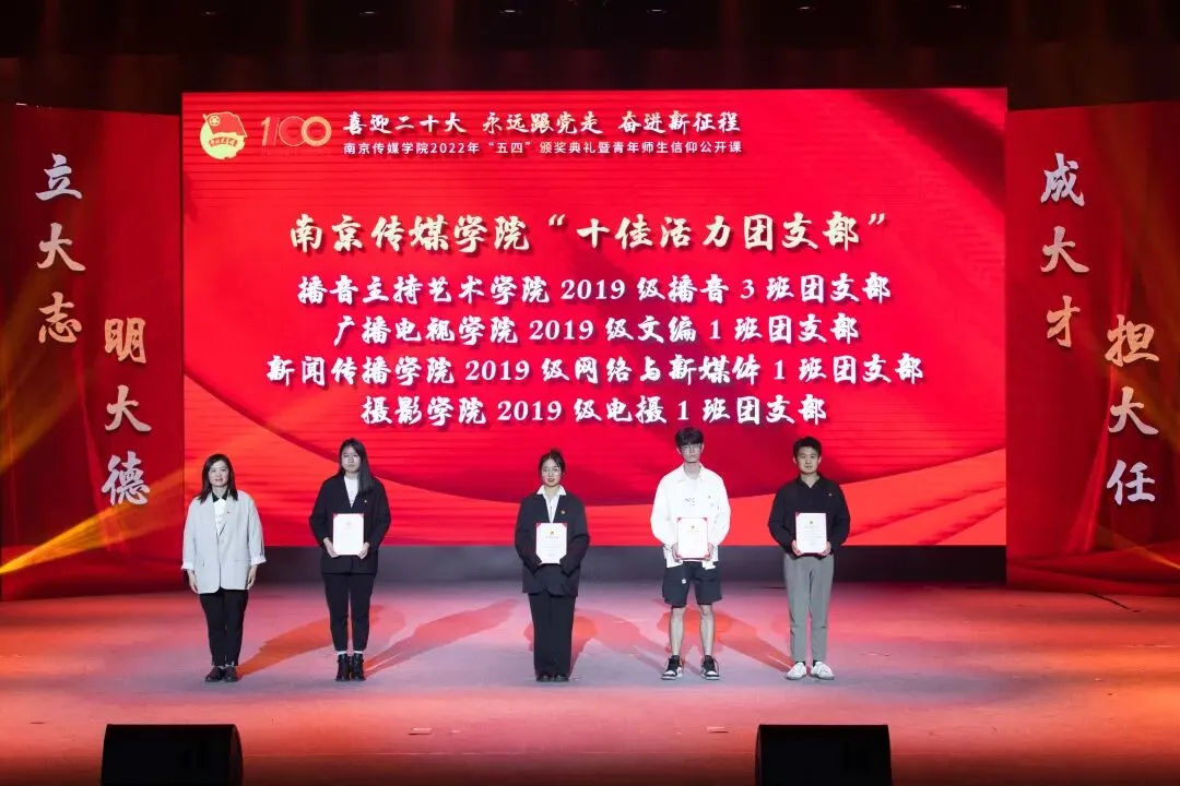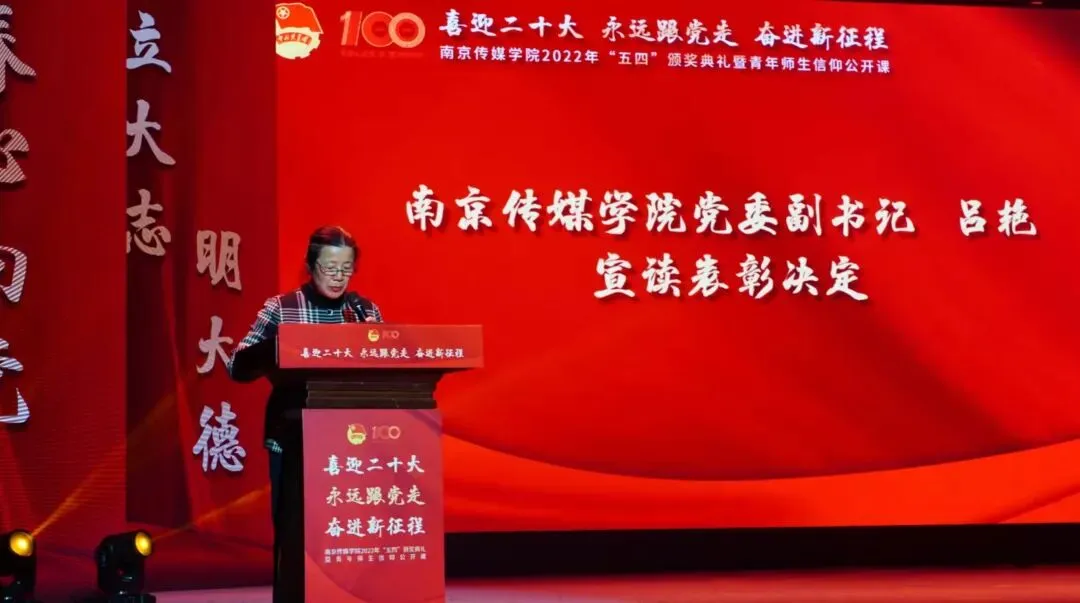 2022年5月4日,“喜迎二十大、永远跟党走、奋进新征程”南京传媒学院2022年“五四”颁奖典礼暨青年师生信仰公开课在实验剧场隆重举行。校党委书记、副校长陈思蒙,常务副校长郎劲松,党委副书记吕艳,党委副书记王宇甜,副校长陈小波,副校长李元临,各学院党总支书记、分团委书记出席本次颁奖典礼,各学院团员代表到场参加,广大团员青年在“南传青年”抖音号观看了直播。