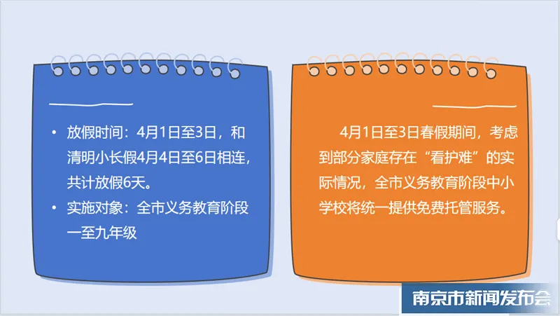 2月9日,南京各区教育行政部门已经通过多种渠道发布了首个春假的具体时间安排:即本次春假在全市义务教育阶段一至九年级中小学范围内实施,时间为4月1日至3日,和清明小长假4月4日至6日相连,共计放假6天。