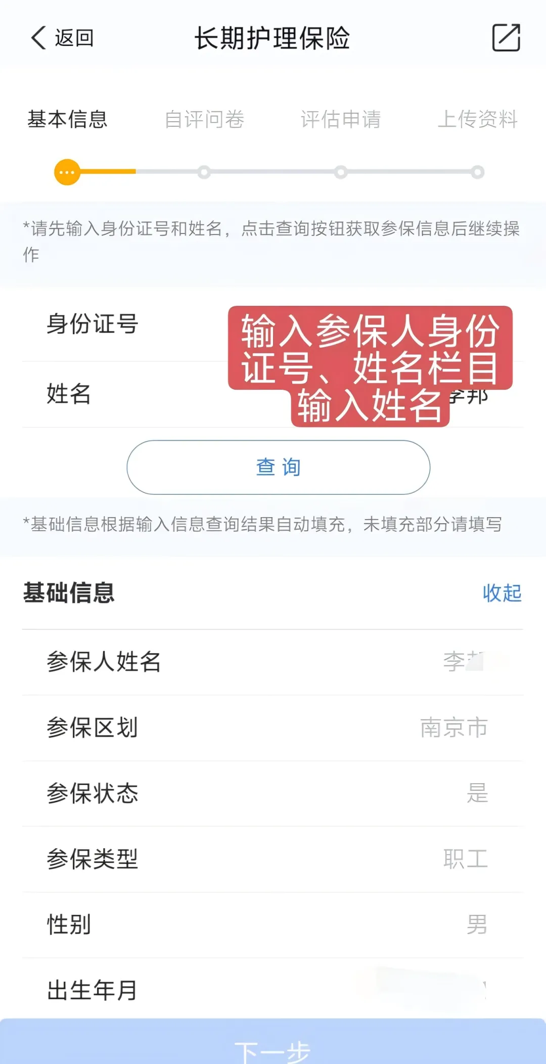 步骤一:关注“南京医保”微信公众号,点击“服务大厅”——“长期护理保险”——选择“评估申请”。输入参保人身份证号、姓名,点击查询,按步骤填写信息,提交审核。
