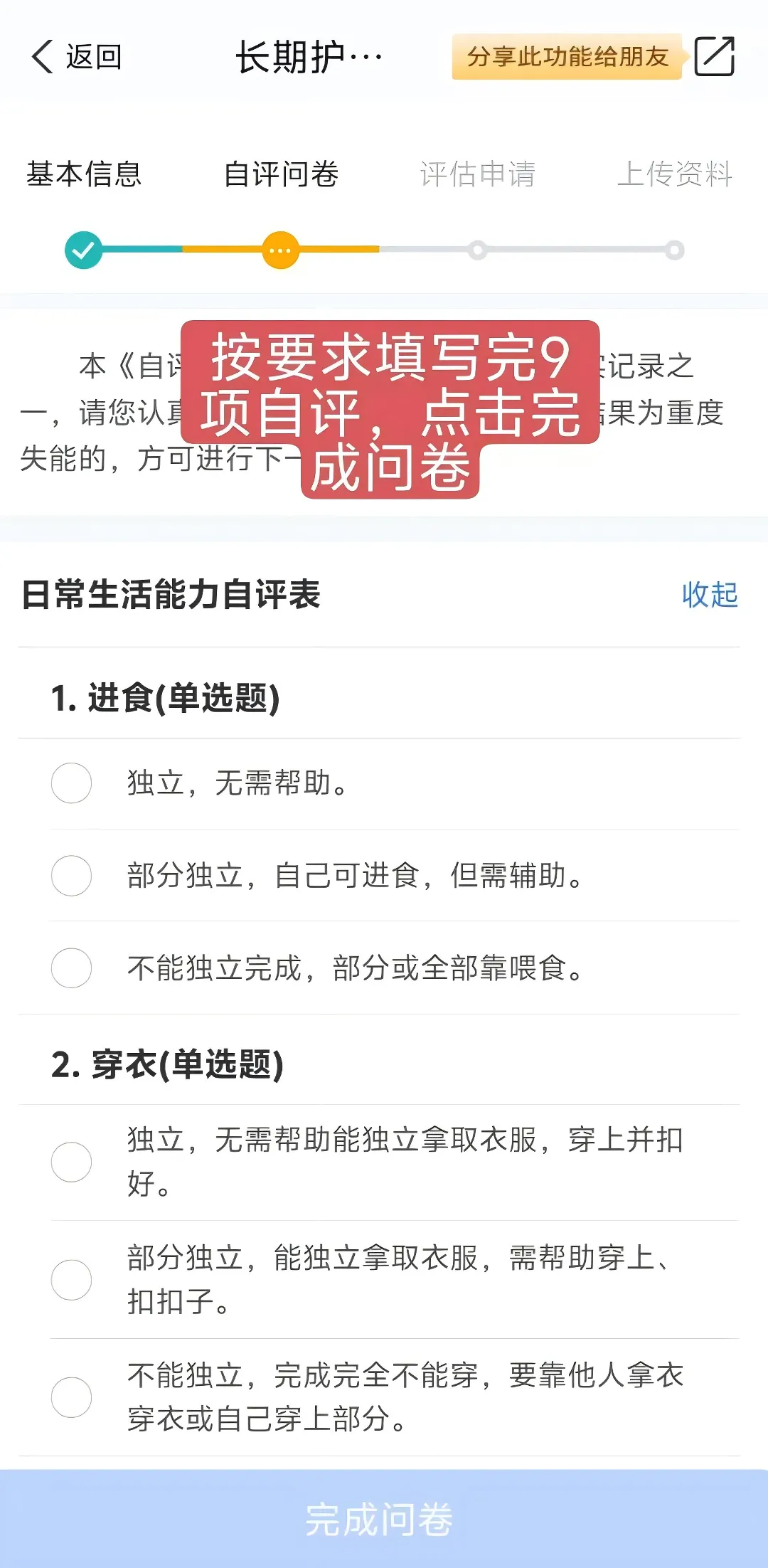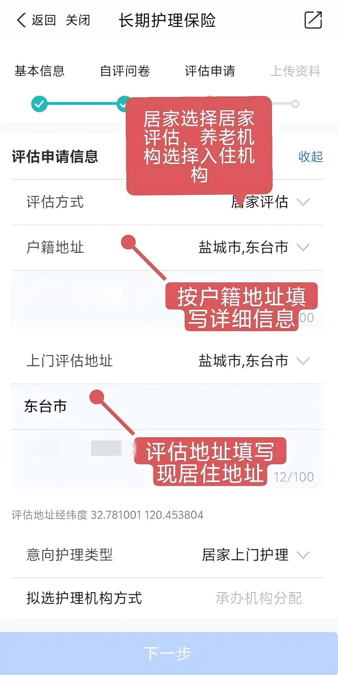 步骤三:填写评估申请信息,享受居家上门照护在评估方式选择——居家评估,意向护理类型选择——居家上门护理;享受入住照护在评估方式选择——住院评估,意向护理类型选择——机构护理。