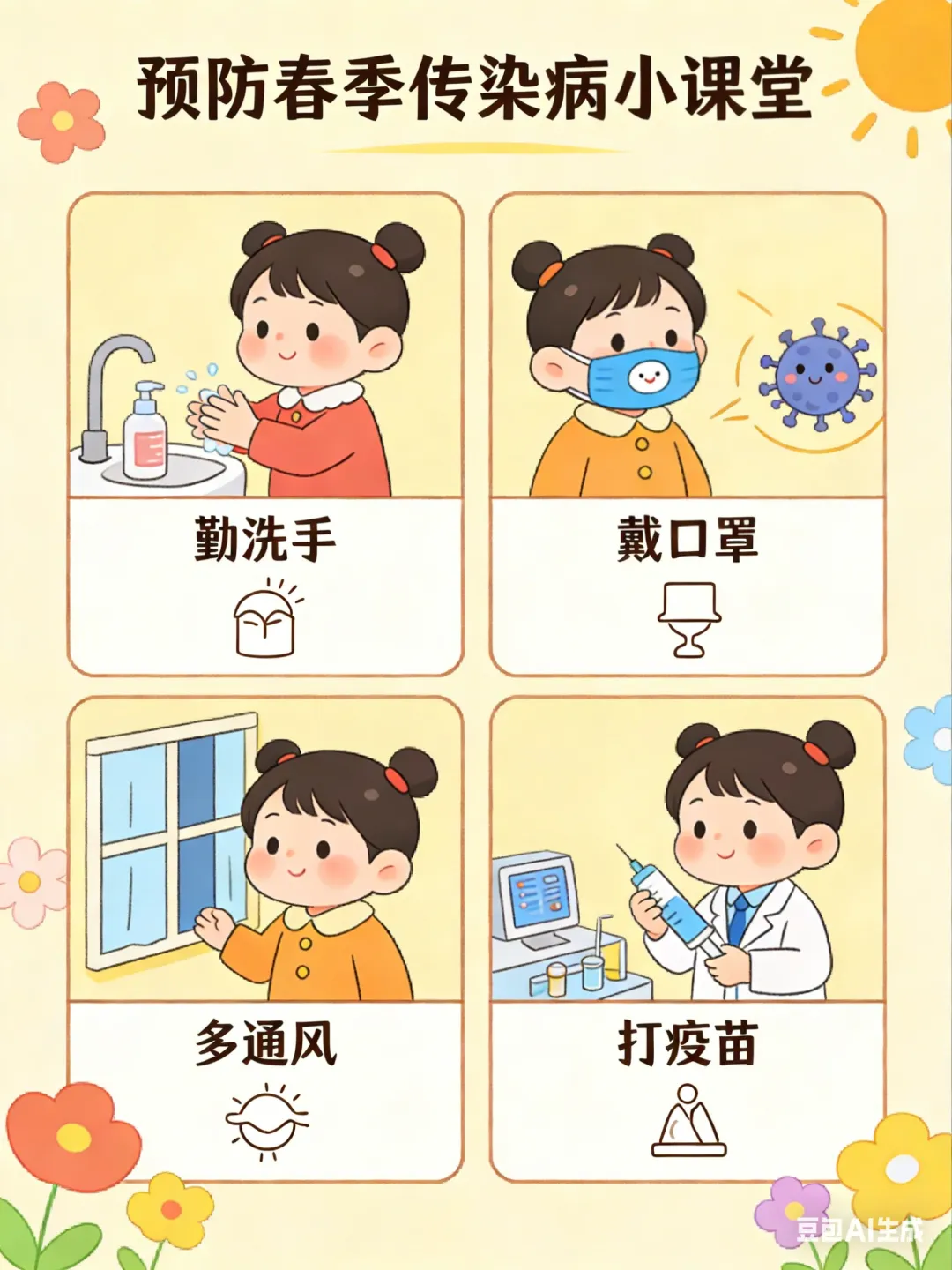 春季气温回升、湿度增加,是流感、手足口病、诺如病毒等传染病高发期,为守护幼儿健康,万福路幼儿园号召家长在放假期间请您配合做好以下防护: