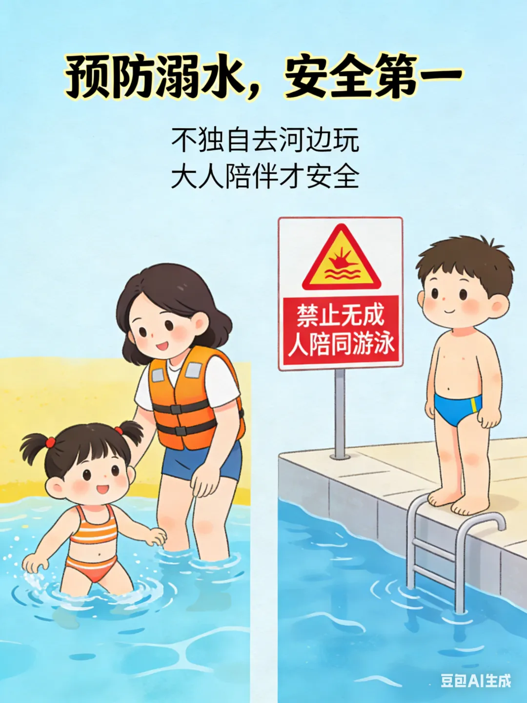 外出一定要有家长陪同,让孩子牢记“防溺水六不准”,特别注意不要让孩子靠近小河、池塘等区域,预防溺水,保护好孩子的人身安全。