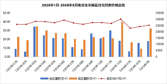 2026年1-3月,南京全市商品住宅累计供应40.21万㎡,同比下滑19%;累计成交58.77万㎡,同比下滑23.7%;整体成交均价24344元/㎡,同比下滑9.9%。3月南京市场如期迎来了一波小阳春行情,一方面是由于前期市场调整下,积累的一波刚性需求释放,另一方面叠加人才补贴、“宁六条”等政策的促进作用,3月环比2月供销数据均有明显提升。但同比数据不及25年,市场仍处筑底修复过程中。