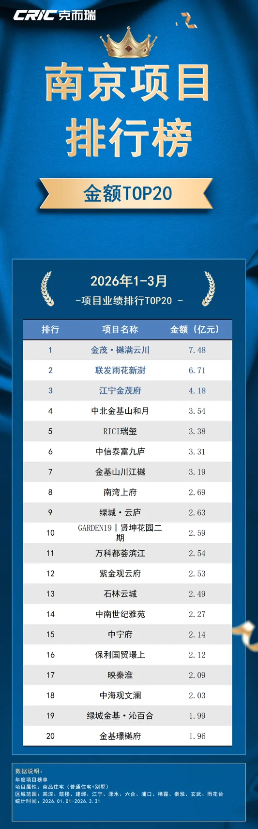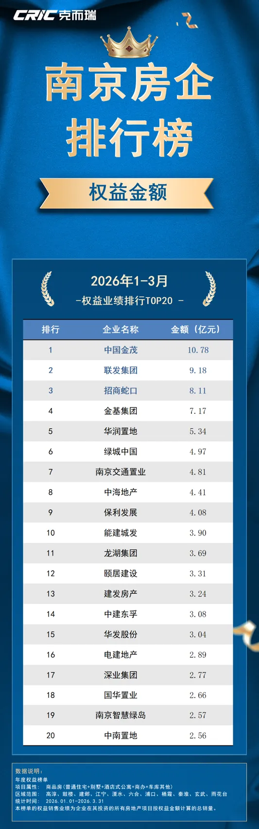 本次克而瑞南京发布《2026年1-3月房企销售排行榜TOP20》,用数据来呈现房企的业绩表现。