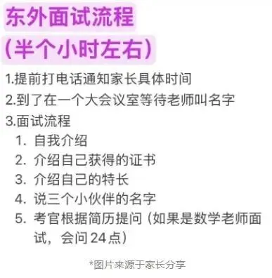 3月17日,有家长接到电话通知,3月21日开始到校面谈,目前仍在持续通知中。面谈内容包括:自我介绍、围绕简历介绍特长和证书,还被问到“介绍三个自己玩得好的小伙伴”。据家长透露,本次面谈为初筛,预计后续还有第二轮测试。
