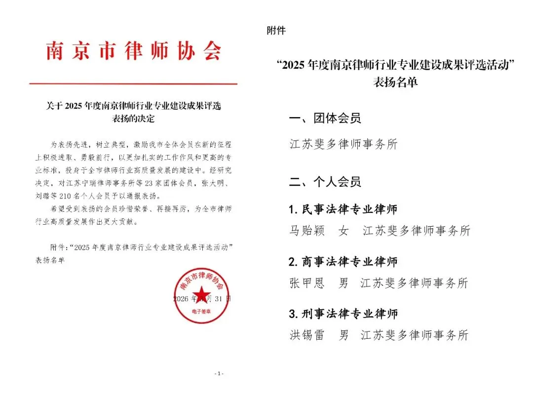 近日,为表扬先进,树立典型,南京市律师协会发布《关于2025年度南京律师行业专业建设成果评选表扬的决定》,对在专业建设领域表现突出的会员予以通报表扬。江苏斐多律师事务所入选“团体会员”表扬名单,我所马贻颖律师获评“民事法律专业律师”个人表彰,张甲恩律师获评“商事法律专业律师”个人表彰,洪锡雷律师获评“刑事法律专业律师”个人表彰,律所与个人双双斩获行业殊荣,彰显了斐多所在专业建设与基层法律服务领域的专业实力。江苏斐多律师事务所一直致力于为客户提供优质的法律服务,力争解决他们面临的法律问题。始终坚持以客户为中心,秉持诚信、专业和敬业的原则,努力为客户争取最佳的法律利益。本次表彰充分肯定了我所律师们的专业素养,更体现出斐多所在多元法律领域长期深耕、厚积薄发的专业底蕴。在今后的工作中,斐多所将继续不忘初心,用专业高效、认真负责的态度为客户提供专业法律服务,争做党和人民满意的好律师,为行业发展与进步贡献自己的一份力量。马贻颖律师,江苏斐多律师事务合伙人,南京市律师协会民商委委员,理论功底扎实,实践经验丰富。曾为多家企业提供常年法律顾问,涉及日常法律咨询、合同风险防范、人力资源筹划与劳资关系处理等等。从业以来,一直秉着“受人之托,忠人之事”的执业理念,运用各种办法帮当事人解决问题,受到广大当事人的好评。执业领域:劳资纠纷、合同纠纷、婚姻继承、借贷纠纷等。