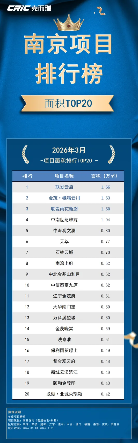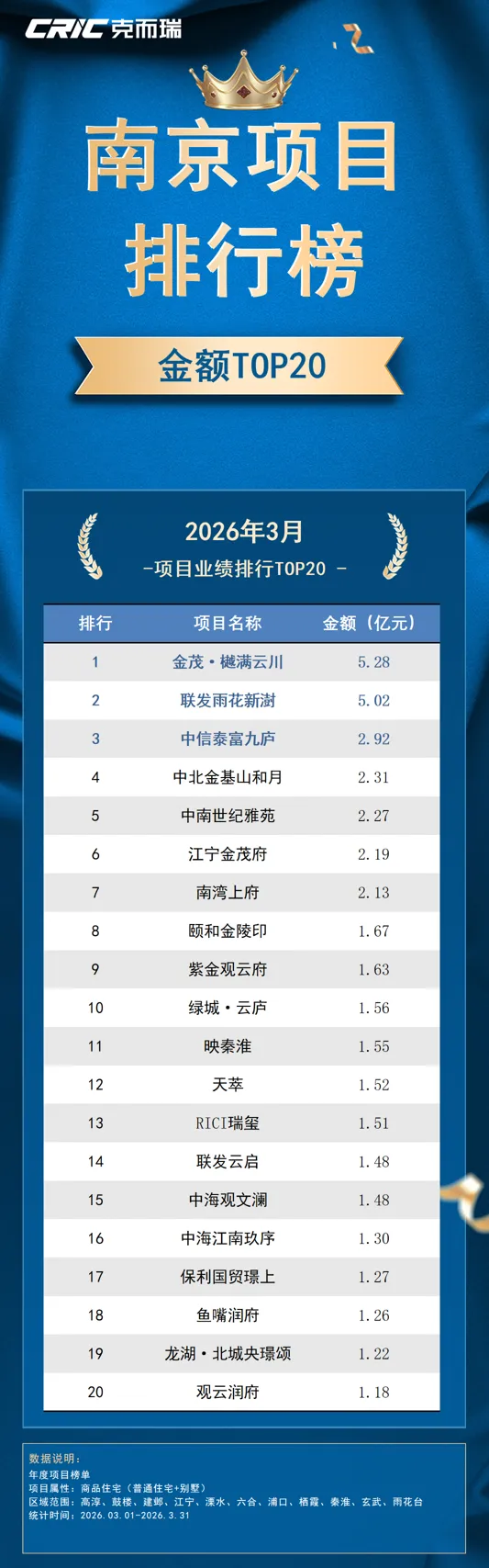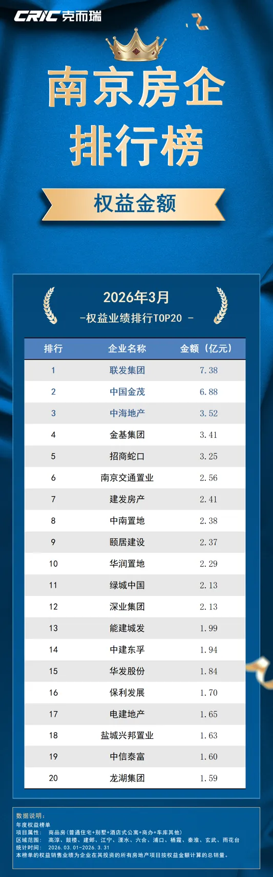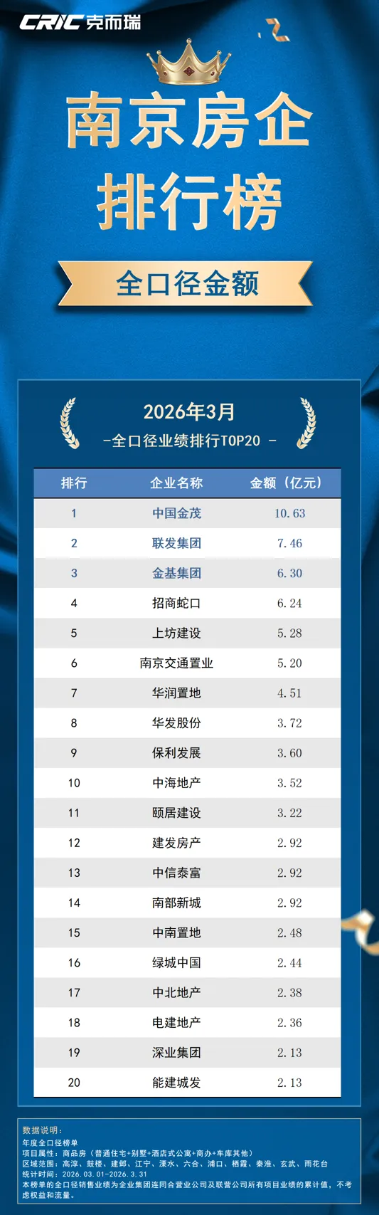 南京2026年3月房企TOP20 | 政策推动楼市回暖,市场迎来阶段性修复