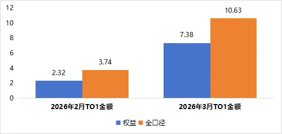从单月TOP1金额数据来看,3月份的权益、全口径TOP1房企销售额均出现明显提升,其中3月权益TOP1销售额7.38亿元,环比提升218%;全口径TOP1销售额10.63亿元,环比提升184%。