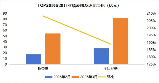 从3月单月的销售业绩来看,整体业绩规模也出现较为明显的上涨。TOP20权益业绩为54.64亿元,环比上涨208%,TOP20全口径业绩82.33亿元,环比上涨189%。