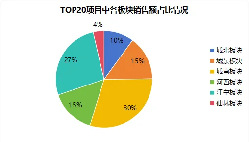Top20项目榜中,城南累计5个项目上榜,销售额达12.29亿元,占前20强市场总成交额的30%,本月城南板块中联发雨花新澍表现抢眼,为3月项目金额榜单TOP2,套数榜单TO1;其次是江宁4个项目上榜,占前20强市场总成交额的27%,金茂樾满云川及江宁金茂府项目均上榜,贡献主力成交份额;河西板块同样有4个项目上榜,瑞玺及南湾上府为主力去化。