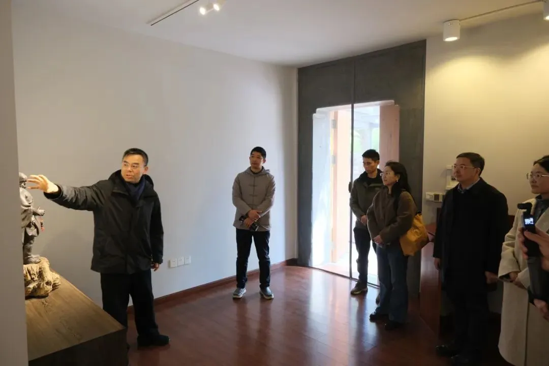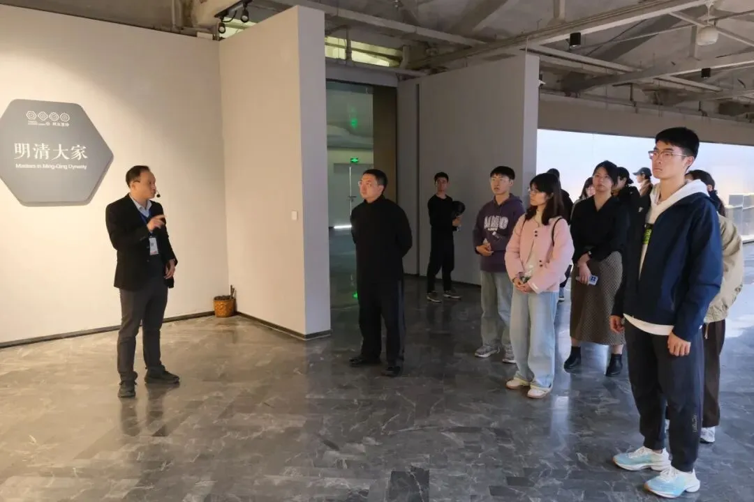 傍晚时分,两队人员在吴鸣艺术馆会合,共同拜访中国工艺美术大师吴鸣,参观吴鸣艺术馆。120余件作品横跨20世纪八90年代至今,吴鸣以肌理表达见长,突破传统光器规整端方的惯常做法,将现代雕塑观念与抽象艺术语言融入其中,东方文人气韵与个人哲学思考并存。“传统根基、现代形态、文人内涵、肌理先锋”——这一创作理念让在场师生对紫砂的跨界可能有了更深认识。