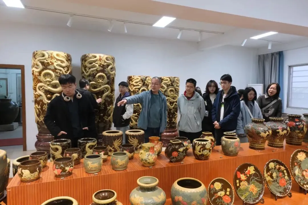 次日上午,师生首先走进宜兴市均陶研究所。宜兴均陶以“堆贴花”工艺为核心,被誉为“陶中瑰宝”。师生通过纪录片了解了均陶“十六指法”的千年传承脉络,在展厅中观摩了张丽、方薛斐等创作者的代表作品。国家级非遗传承人方卫明大师随后与师生面对面交流,详细讲解“堆花”“贴花”的技法。谈及手艺时,老先生的认真与执着令人动容。