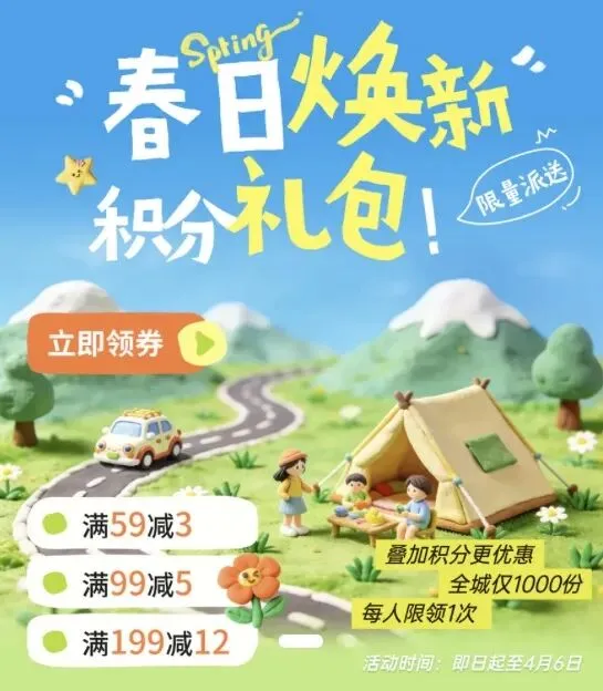 打开「宁通行app」→“小蓝鲸·积分商城”→点击首页活动窗口【春日焕新积分礼包】参与-结算满减优惠+积分抵扣