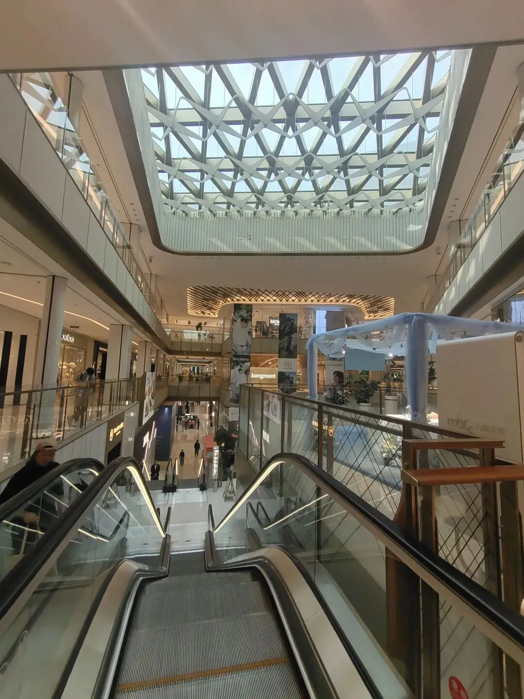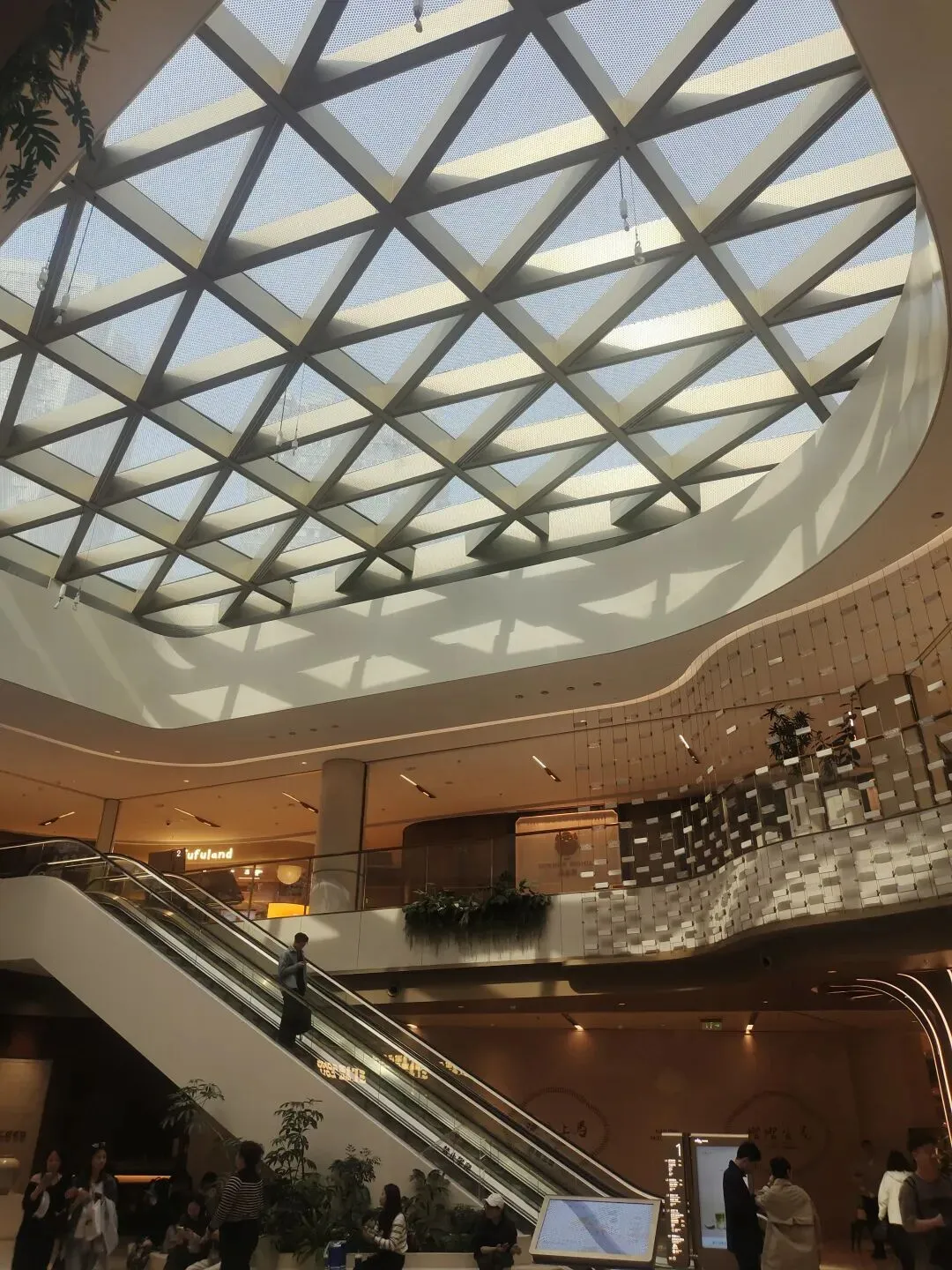 万象天地很多地方的屋顶都是通透的玻璃顶,因此室内光线较自然,如A座有一处很大的中庭,从负一层开始,贯穿好几层楼,人们从自动扶梯上下楼时,可看到商场内很多场景。