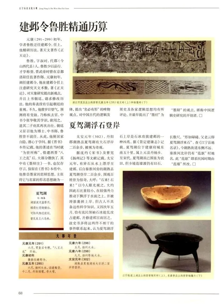 南宋《景定建康志》:夏驾湖在城东南五十里,属上元县丹阳乡,今为田。事迹:曹宪扬州记云:晋惠帝永宁二年,有石浮来建邺,自秦淮夏驾湖登岸二百余步,百姓咸曰:石来,石来!至明年,石冰果入扬州。沈约《宋书》:晋惠帝太安元年,丹阳湖熟县夏驾湖有大石浮二百步而登岸,民惊噪曰:石来!于宝曰:寻有石冰入建邺。今丹阳乡范墟渡旧有石浮数尺,形如碌礴,父老云:即古夏驾湖浮来石也。南京江宁湖熟是外秦淮河畔的一座古镇,至今已有四五千年的历史,境内遍布历史文化遗迹,位于范区村中央的王高氏宗祠就是其中一处。这是一个以王姓为主的自然村,115户村民大多是同宗的本家,王高氏祠堂是他们每年清明祭祖必去的场所。目前村里最年长、辈分最高的是80岁的王际丹老人,听说凤凰石雕被偷,他拄着拐杖,颤颤巍巍地赶过来。“打有这个祠堂起,我们王氏已经27世了,算起来,这个祠堂至少有400多年历史了,应该是建于明代中晚期。”