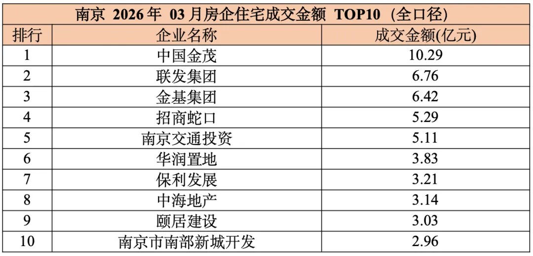 2026 年1-3 月,南京房企销售排行榜呈现明显的头部固化特征。中国金茂、金基集团、招商蛇口荣登全口径榜前三强,销售额均超10 亿元。头部房企凭借产品迭代、市场口碑、数字化营销构筑稳固优势,在行业规模理性回调背景下,市场份额向优质房企集中。