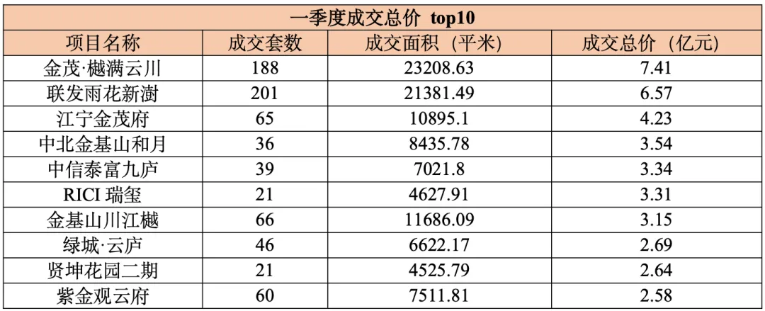 南京一季度住宅市场以存量项目为主,仅金茂樾满云川一个新盘上市。前十的楼盘贡献了39.46亿元的销售额,其中69%的业绩来自3月,销售额为27.2亿元。