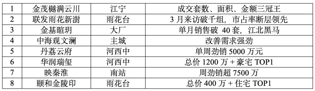 3 月单月表现更为亮眼,金茂在江宁区域三盘成交套数、面积、金额遥遥领先,相当于江宁每成交2 套,即有 1 套来自金茂。江宁竹山路樾满云川夺得南京全市3 月成交套数、面积、金额"三冠王",成交134套,销售额突破5.21 亿元,金茂成为唯一单月销售额破10亿元的房企。联发以江宁云启和雨花新澍两个刚需楼盘为主达成了单月6.76亿元的亮眼成绩,可谓流量之王。金基集团在无新盘上市的情况下靠山川江樾、山和月等板块品质豪宅稳扎稳打贡献了6.42亿元的销售额。