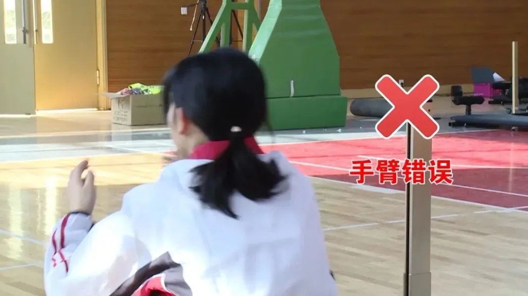 两脚原地前后站立投掷的考生,球出手后下肢可交叉换步缓冲;两脚原地左右分开站立投掷的考生,球出手后双脚可腾空再落地缓冲。