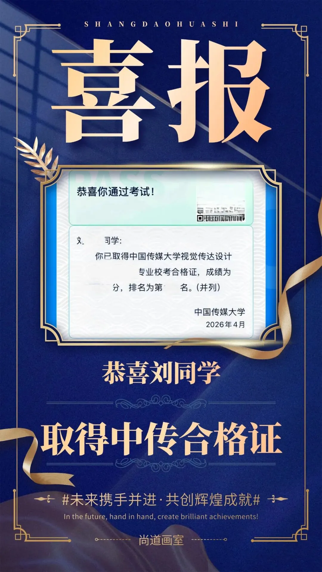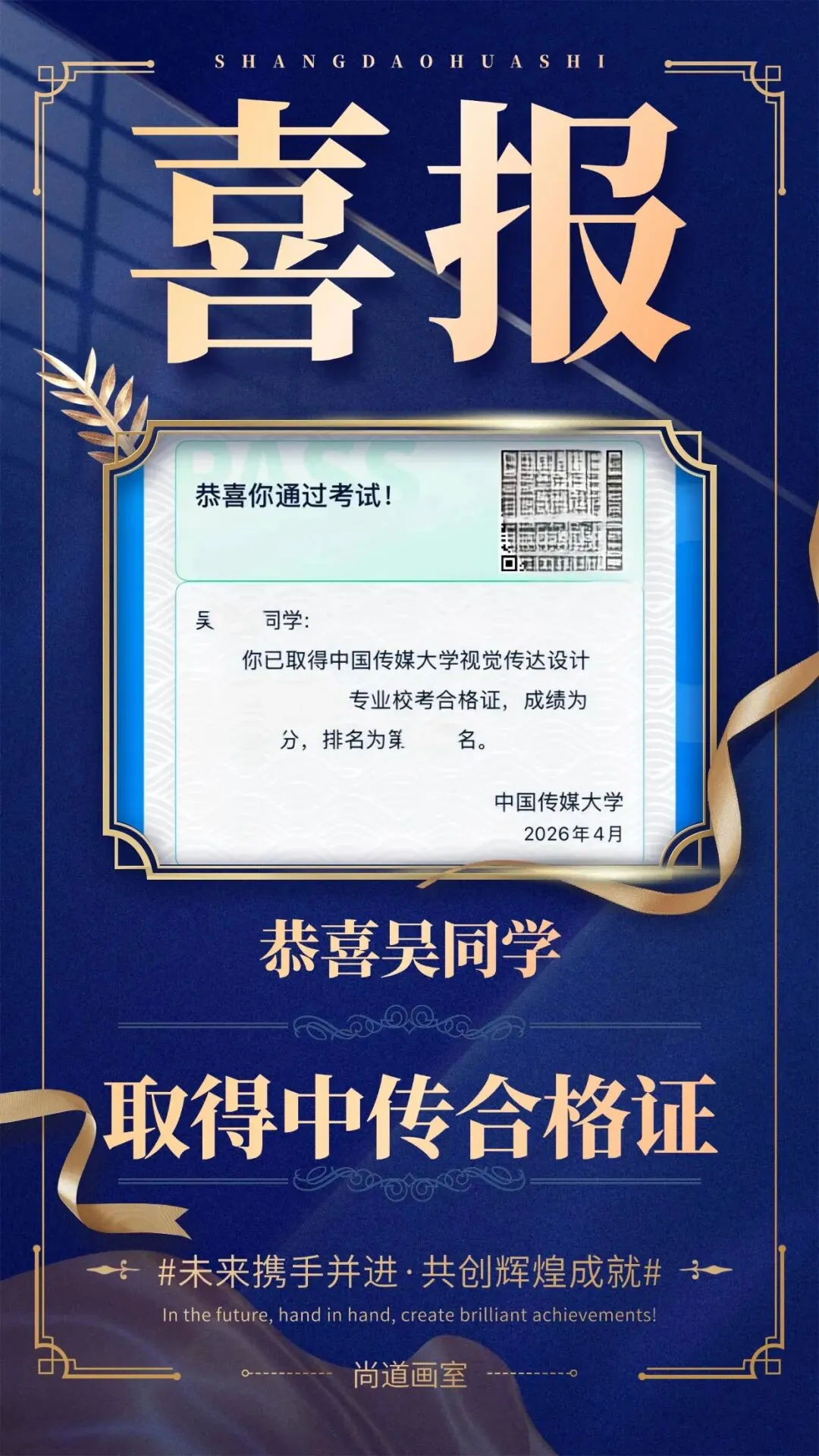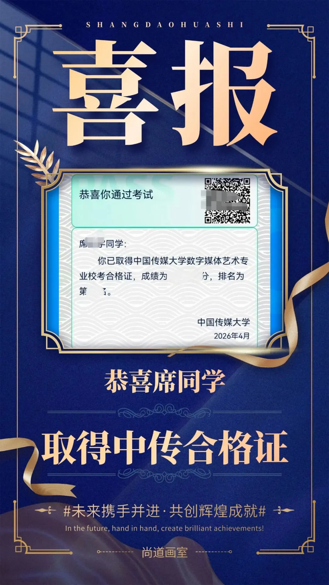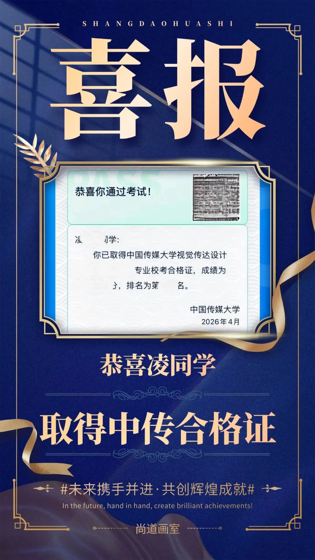 2026年中国传媒大学校考结果揭晓,南京尚道画室学子以全员通过的绝对优势,在江苏省内交出唯一一份“全员拿证”的满分答卷!