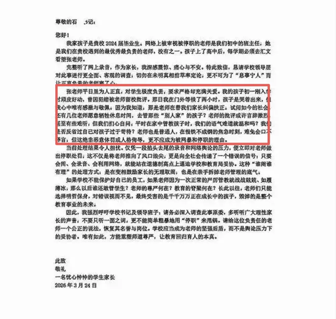 反转来得猝不及防,却又在情理之中。一大批张老师所在班级的在校家长、甚至往届学生及家长,自发联合起来,写下了一封长长的联名信,只为给张老师正名。信中,家长们字字恳切,言辞间满是对张老师的认可与感激。他们一致表示,张老师是孩子们求学路上遇到过的最优秀、最负责的好老师,她严厉的背后,是对学生的殷切期望,是对教育事业的赤诚热爱。课堂上,她认真授课、因材施教;课后,她主动关心每一个孩子的成长,耐心解答疑问、疏导情绪,甚至牺牲自己的休息时间,为基础薄弱的学生补课。
