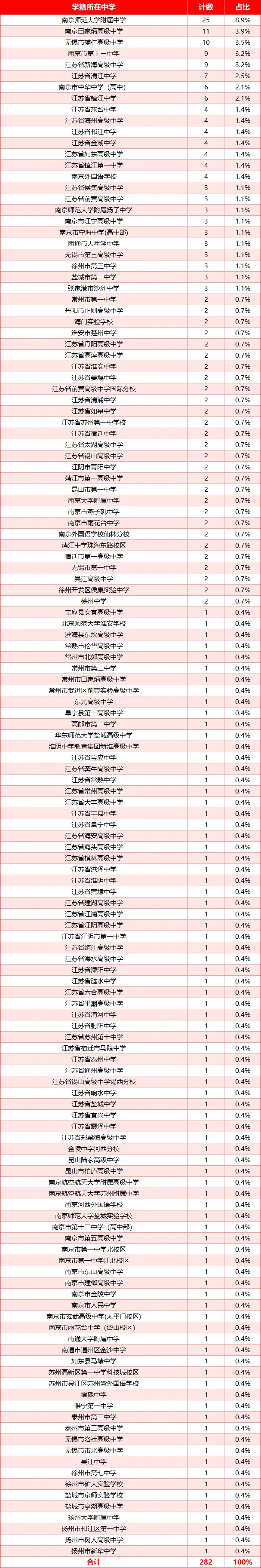 南师附中:25人,占总人数的8.9%