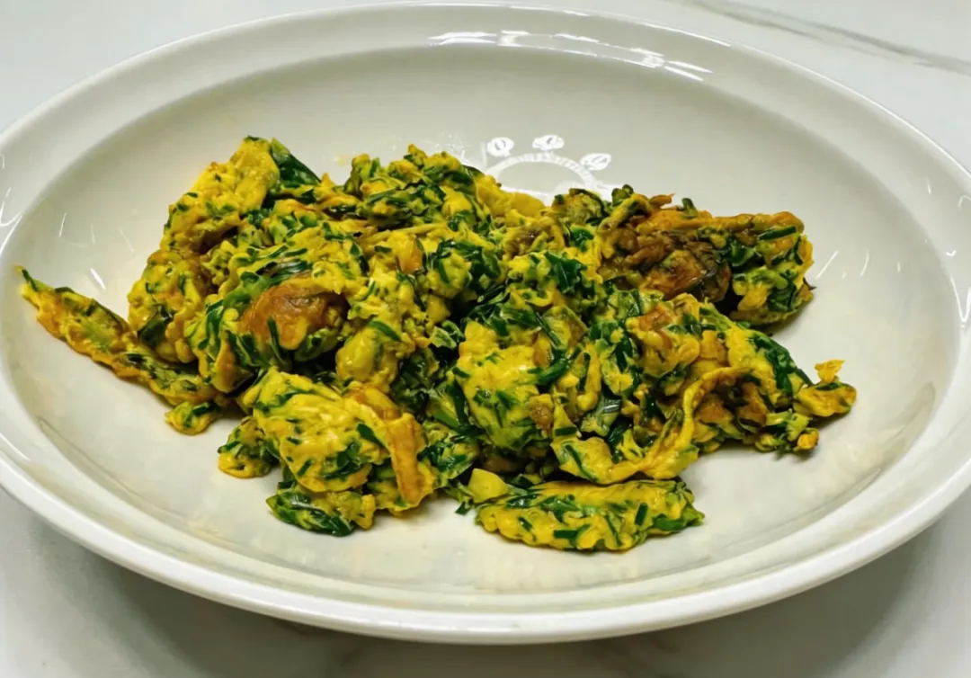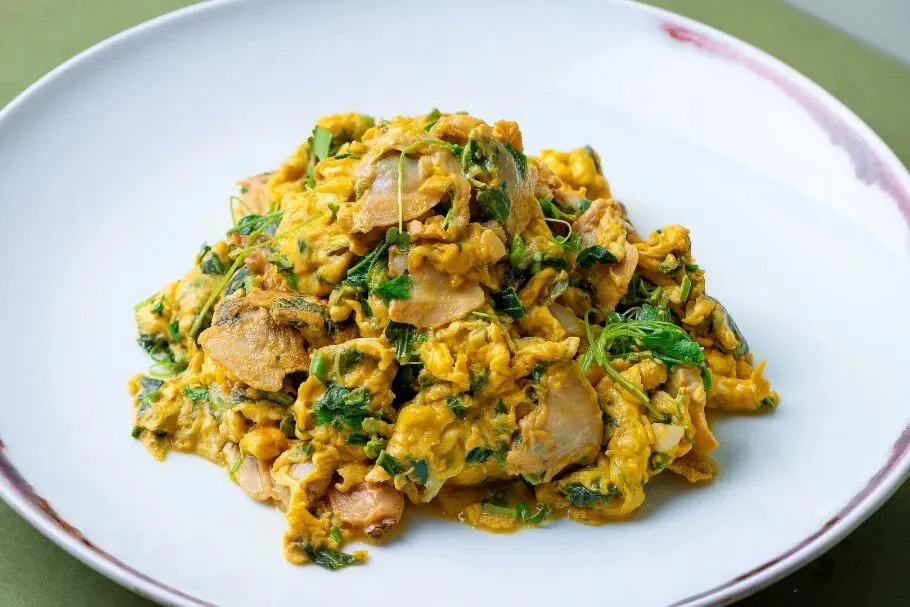 香椿文蛤滑蛋,头茬香椿清芬扑鼻,文蛤鲜润多汁,与滑嫩的鸡蛋同炒,金黄翠绿相映。