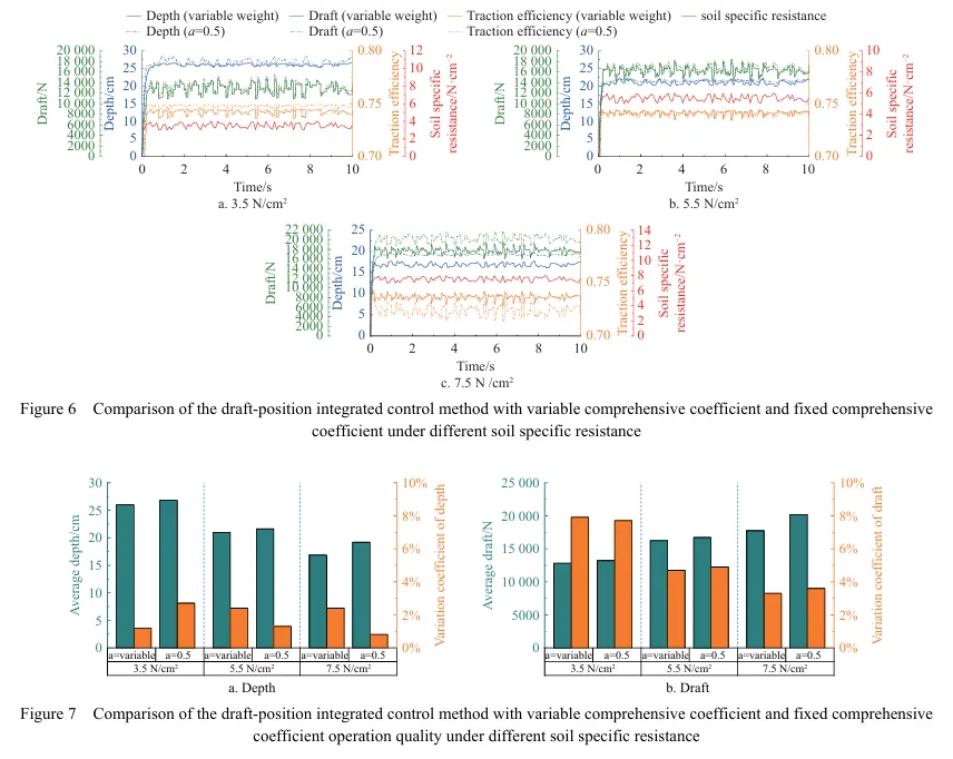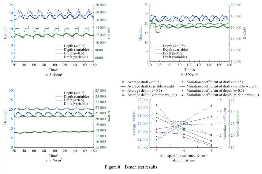 为验证控制方案的性能,搭建了控制系统仿真模型与台架试验平台,并与综合度系数固定为0.5的力位综合控制方法进行性能对比。结果表明:可变综合度系数耕深控制方法能根据土壤条件变化自动调节综合度系数,具有更高的牵引效率;在阻力较小范围内能更好地保证作业质量,在阻力较大范围内可保证发动机性能并防止拖拉机受损。该方法对复杂田间作业环境具有更强的适应性,可为耕深控制方法研究提供参考。