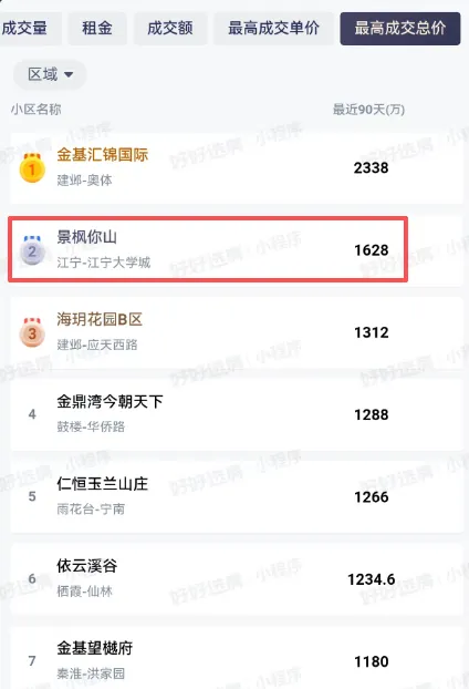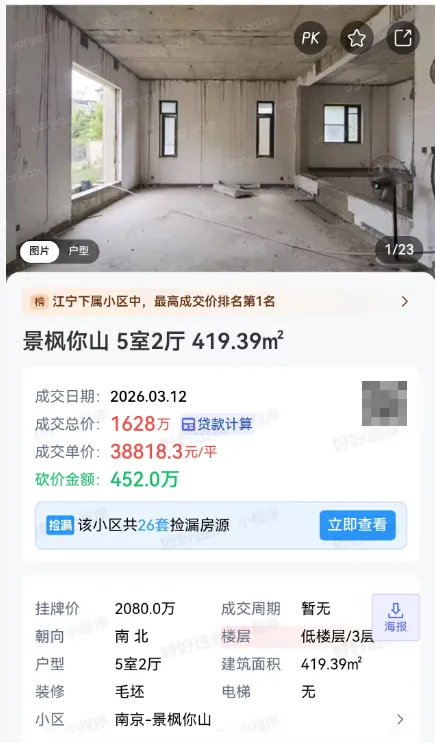 刚刚,我看到景枫你山成交1套二手房,总价高达1628万,直接刷新了今年江宁成交总价天花板!