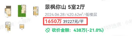 我查询该小区的成交记录发现,这也是景枫你山成交总价的第二高。早在2024年6月,该小区曾成交过一套420.62㎡联排,当时总价1650万元。