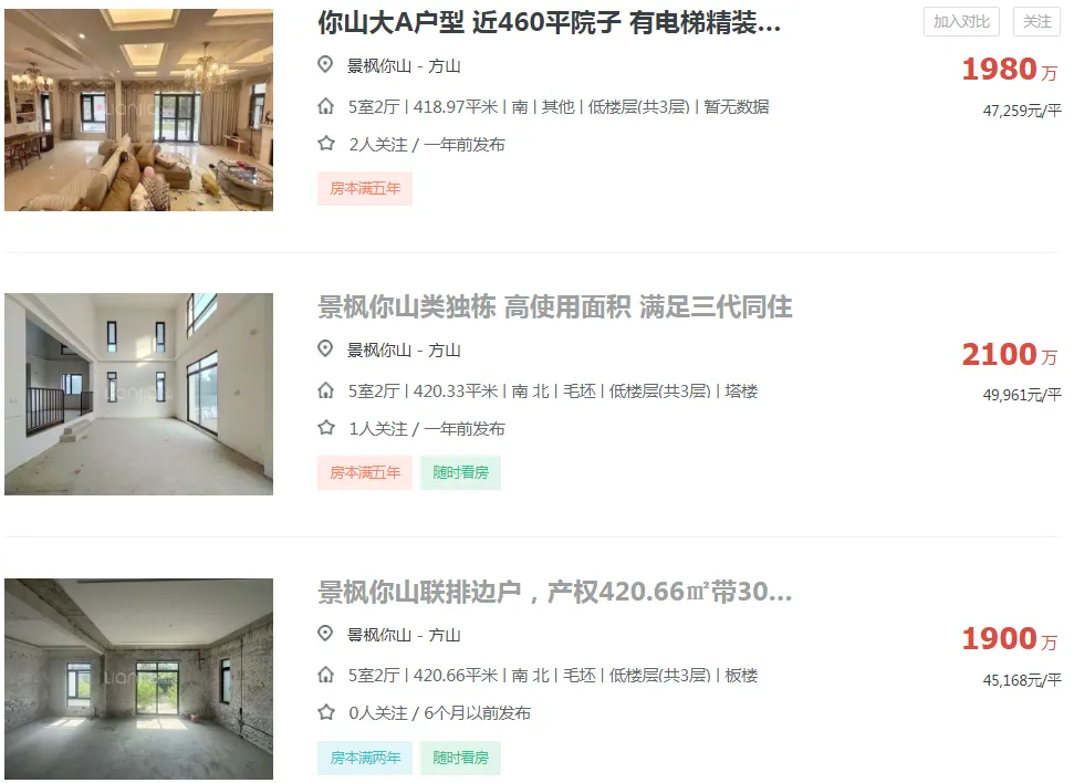 从某二手房平台的挂牌来看,目前景枫你山建面约420㎡左右的联排,还有3套房源挂牌在售,总价从1900-2100万元不等,单价约4.5-4.9万/㎡。